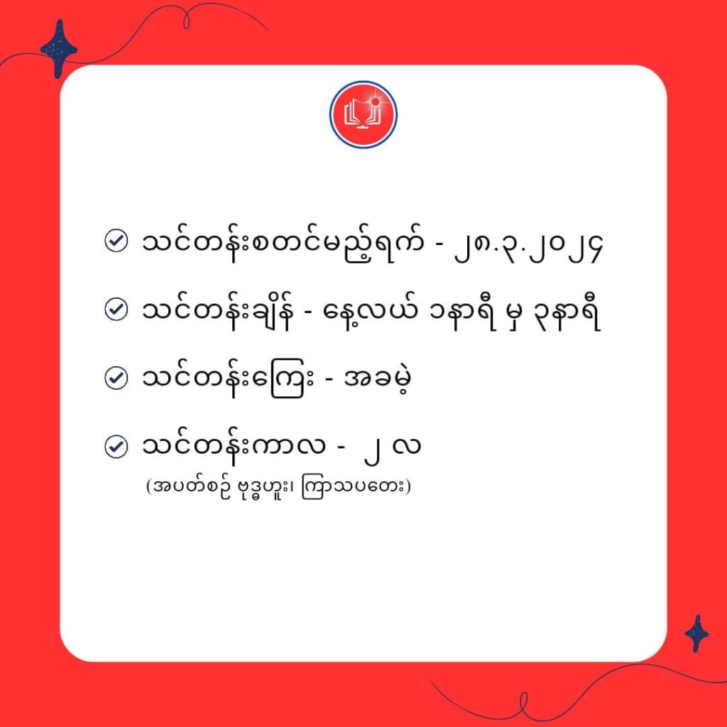 แแแบแแแบแธแแปแญแแบ – Mon (9:00AM – 11:00 AM), Fri & Sat (9:00AM – 12:00 PM)